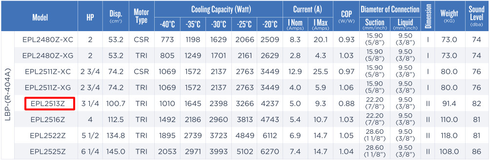 | Công suất lạnh | 3.266 kW tại Te = – 25℃ |