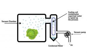 Đây là phương pháp mới dùng cho rau quả là chính. Rau quả được xếp vào một phòng kín bằng kim loại. Sau khi đóng kín phòng được hút chân không nhờ các máy nén kiểu ejector. Dưới áp lực chân không, hơi nước từ chính rau quả bốc ra để làm lạnh rau quả. Phương pháp này có ưu điểm là quá trình rất nhanh. Nhưng vẫn đảm bảo chất lượng và mỹ quan sản phẩm.